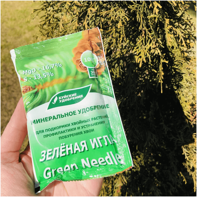 «Зеленая игла» 100 г. (пакет) – это кристаллический порошок, который предназначен для разведения в воде и последующего полива (корневое питание). 15-25 г на 10 л. воды и внесение так же по площади кроны в дозе 5-10 л на квадратный метр. Желательно в сухую землю жидкие подкормки не делать. На песчаных почвах и в засушливую погоду предварительно делается полив растения, а затем подкормка. Такую процедуру можно делать 3-4 раза за сезон, начиная с возобновления вегетации.