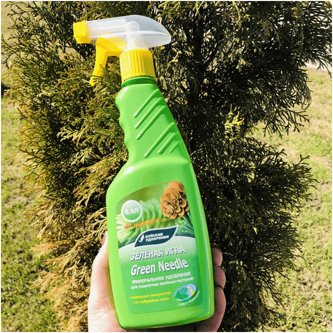 «Зеленая игла» 500 мл (спрей)– это готовый раствор, который предназначен для опрыскивания хвойных растений (некорневое питание). Норма расхода – до полного смачивания хвои, но стекать раствор на землю не должен. В зависимости от состояния хвойных растений, такие подкормки необходимо проводить не чаще одного раза в 2 недели.