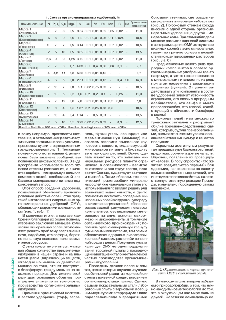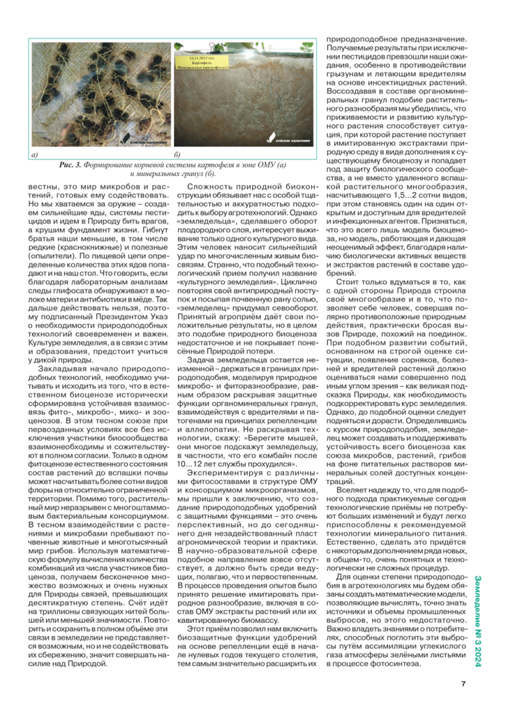 Проведены десятки полевых опытов, целью которых служило изучение особенностей развития корневой системы в почвенной среде с внесением органоминеральных гранул. Однако самыми показательными стали лабораторные опыты с зерновыми и овощными культурами в террариуме в виде параллелепипеда с прозрачными боковыми стенками, светозащитными экранами и инертным субстратом. По боковым стенкам сосуда вносили с одной стороны органоминеральные удобрения, с другой – минеральные соли. При этом наблюдали мощное развитие корневой системы в зоне размещения ОМУ и отсутствие видимых корней в зоне минеральных гранул по причине солевого воздействия концентрированных растворов. Предназначение целого ряда природных компонентов в составе органоминеральных удобрений где-то напрямую, а где-то косвенно связано с минеральным питанием, но их роль при этом неоценима в реализации защитных функций. От умения задействовать эти компоненты в составе удобрений зависит устойчивость агроценоза, его связь с природным сообществом, это альфа и омега природоподобия, это способ, содействующий стабильности биосферы в целом! Природа подаёт нам множество тревожных сигналов и раскрывает обилие причинно-следственных связей, которые, будучи пренебрегаемыми, вызывают снижение урожая сельскохозяйственных культур и качества продукции. Скромным достигнутым результатам предшествуют болезни растений, вредители, сорняки и другие напасти. Впрочем, появление их провоцирует человек. В пору спросить: «Кто же затеял вредительство первым?» Вся ядохимия, направленная на защиту сельскохозяйственных растений, это инструмент противодействия на естественную ответную реакцию Природы, изначально порожденную самим человеком.