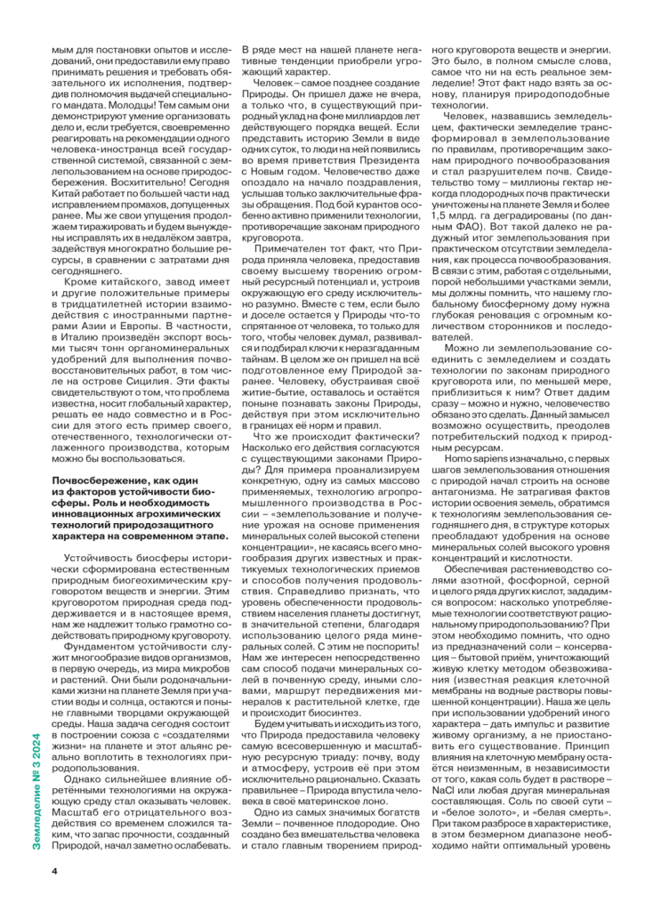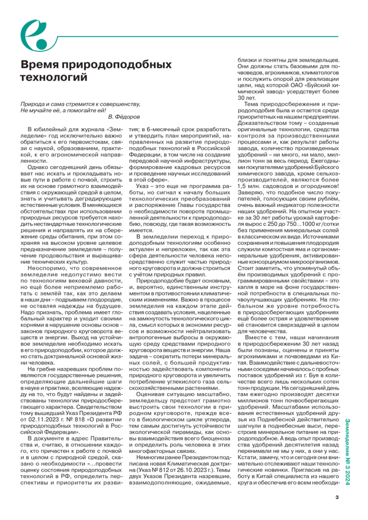 Немногим ранее Президентом подписана новая Климатическая доктрина (Указ № 812 от 26.10.2023 г.). Темы двух Указов Президента назревшие, взаимодополняющие, ожидаемые, близки и понятны для земледельцев. Они должны стать базовыми для почвоведов, агрохимиков, климатологов и послужить опорой для реализации цели, над которой ОАО «Буйский химический завод» усердствует более 30 лет. Тема природосбережения и природоподобия была и остается среди приоритетных на нашем предприятии. Доказательством тому – созданные оригинальные технологии, средства контроля за производственными процессами и, как результат работы завода, количество произведенных удобрений – ни много, ни мало, миллион тонн за весь период. Ежегодными покупателями удобрений Буйского химического завода, кроме сельхозпроизводителей, являются более 1,5 млн садоводов и огородников! Заверяю, что подобное число покупателей, голосующих своим рублём, очень важный индикатор полезности наших удобрений. На опытном участке за 30 лет работы урожай картофеля вырос с 250 до 750…1000 кг/сотки без применения минеральных солей в классическом их виде. Источниками сохранения и повышения плодородия служили компостная яма и органоминеральные удобрения, активированные консорциумом микроорганизмов. Стоит заметить, что упомянутый объём производимых удобрений с программированными свойствами – это капля в море на фоне государственной потребности в специальных почвоулучшающих удобрениях. На глобальном же уровне потребность в природосберегающих удобрениях ещё более острая и удовлетворение её становится сверхзадачей в целом для человечества.