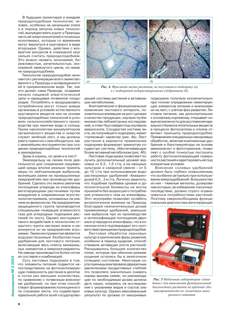 Суть листовых подкормок в том, что элементы питания подаются непостредственно на фотосинтезирующую поверхность растения в десятки и сотни раз меньших количествах, по сравнению с почвенным внесением удобрений, но при этом способствуют формированию полноценного по строению листа, что содействует идеальной работе всей сосудопроводящей системы растения и активизации метаболизма. Анатомические и функциональные изменения листового аппарата, положительно влиявшие на рост урожая и качество продукции, изучали путём множества лабораторных исследований, и ответ был найден под окуляром микроскопа. Сосудистая система листа, не получившего подкормку, имеет «тупиковый» характер. Лист растения в варианте применения подкормки формирует замкнутую сосудистую систему, обеспечивающую более активный метаболизм. Листовая подкормка позволяет получить дополнительный урожай зерновых от 0,3…1,5 т/га, а на овощных культурах и сахарной свекле – от 5 до 15 т/га при использовании водорастворимых удобрений «Акварин» дозой 0,5…3 кг/га. Логично заметить, что подобная прибавка урожая и дополнительной биомассы не могла произойти без возросшего потребления углекислого газа из атмосферы. Этот агроприём позволяет ослабить антропогенное влияние на Природу благодаря незначительным дозам применяемых удобрений, уменьшения выбросов при их производстве и интенсификации поглощения двуокиси углерода из атмосферы, что в конечном итоге подтверждает его соответствие принципам природоподобия.