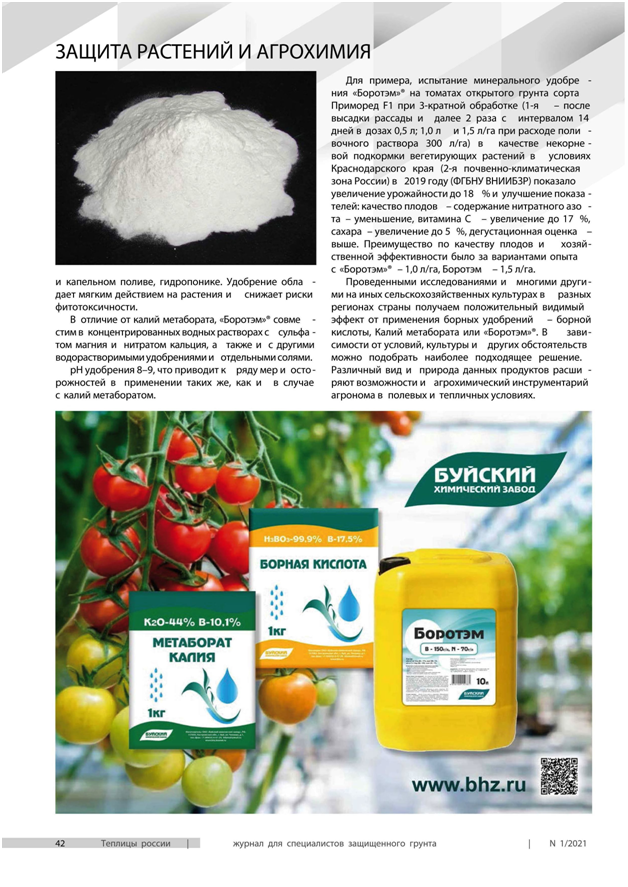 С продуктами Калий метаборат и «Боротэм»® наоборот – их эффект глубоко изучен нами в открытом грунте на злаковых и масличных, плодовых и овощных культурах. С полным основанием можно утверждать, что они будут особенно эффективны и востребованы в условиях тепличного производства на инертных субстратах с нулевым стартовым уровнем по такому важному элементу, как Бор.