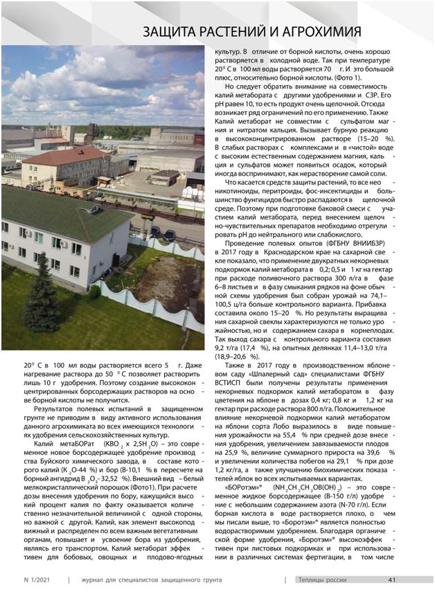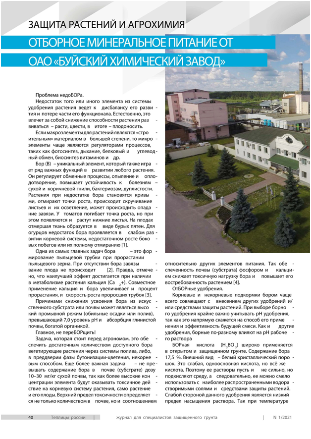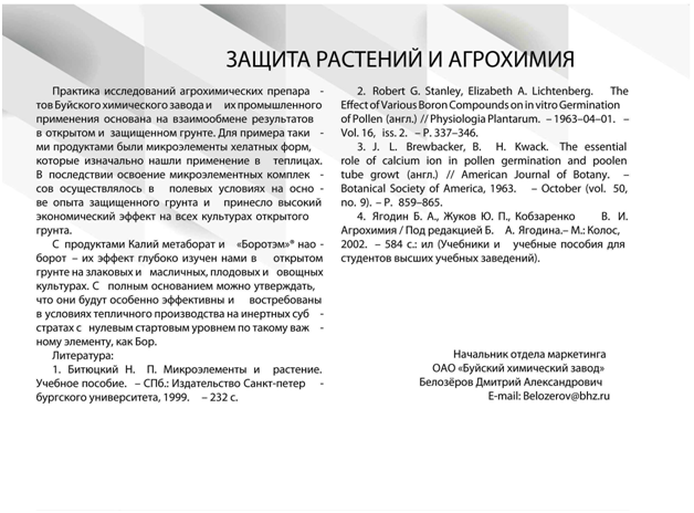 Практика исследований агрохимических препаратов Буйского химического завода и их промышленного применения основана на взаимообмене результатов в открытом и защищенном грунте. Для примера такими продуктами были микроэлементы хелатных форм, которые изначально нашли применение в теплицах. В последствии освоение микроэлементных комплексов осуществлялось в полевых условиях на основе опыта защищенного грунта и принесло высокий экономический эффект на всех культурах открытого грунта.