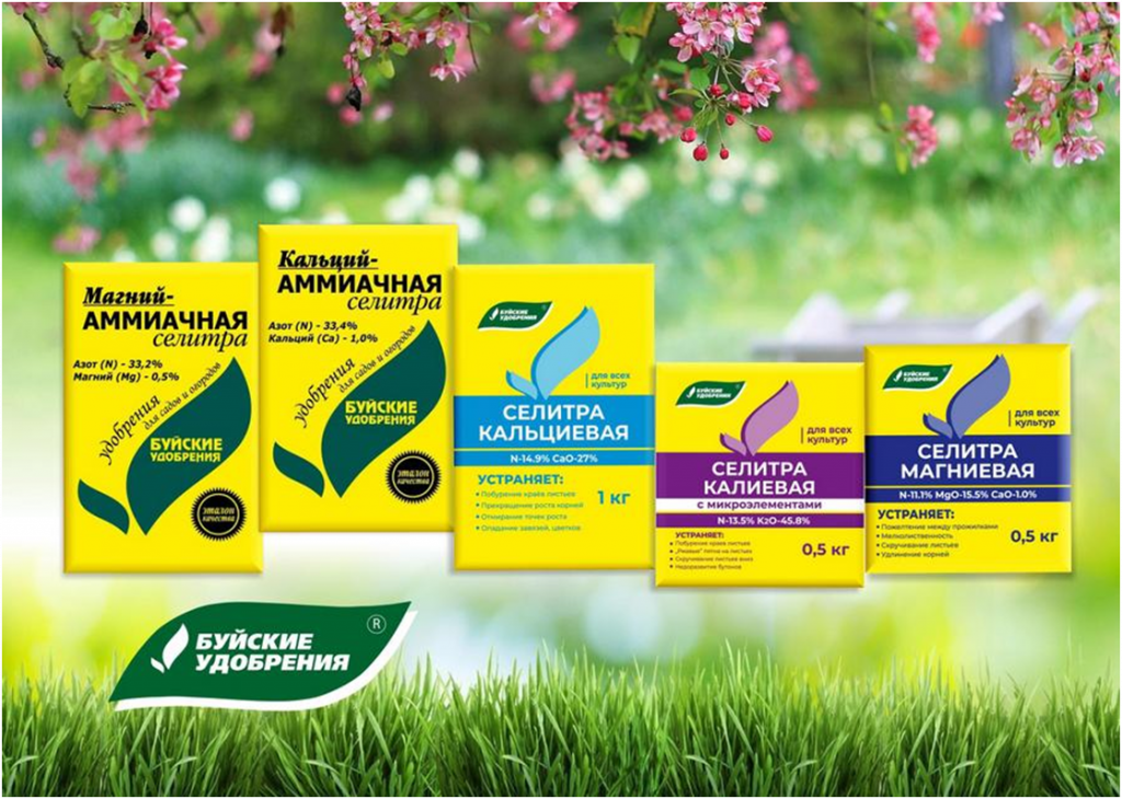 ОАО "Буйский химический завод" производит два вида аммиачной селитры – кальций-аммиачная селитра (Nобщ. – 33,4%, Ca – 1%) и магний-аммиачная селитра (Nобщ. – 33,2%, Mg – 0,5%). Первая дополнительно положительно влияет на развитие корневой системы, укрепление клеточных стенок и проводящих тканей, вторая – усиливает фотосинтез, обмен веществ.